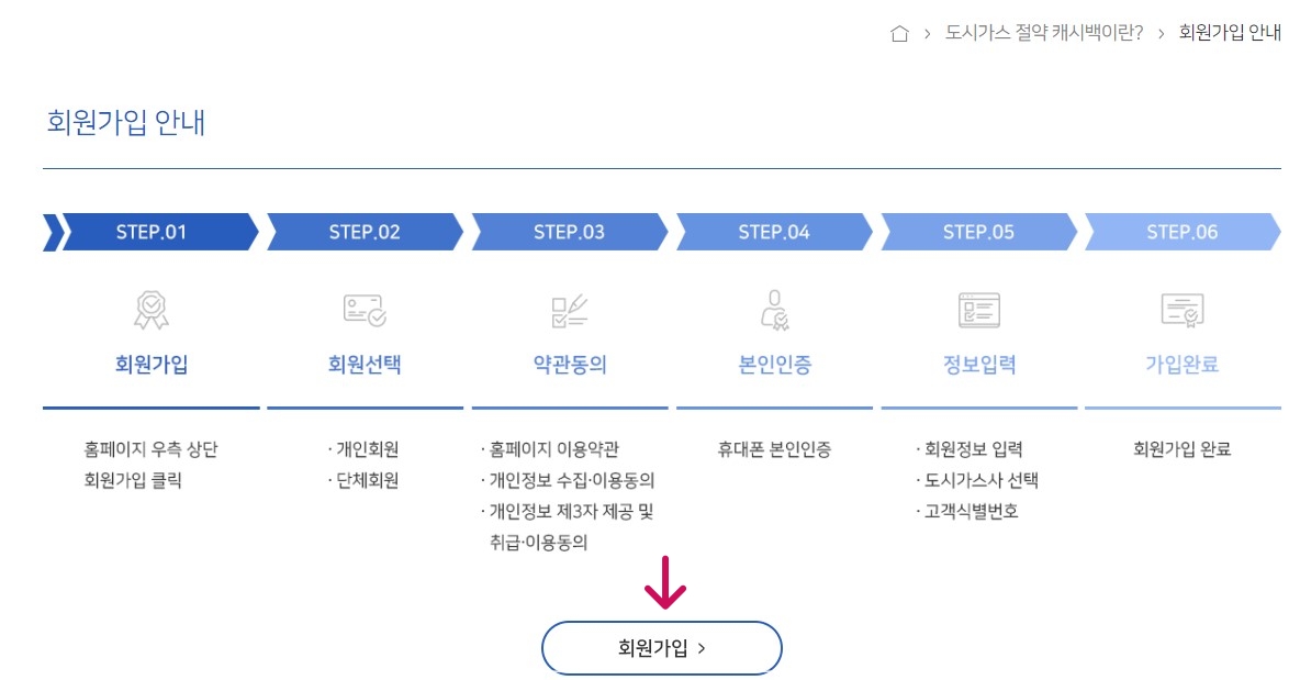 캐시백을 신청하려면 우선 '도시가스 캐시백 홈페이지'를 통해 회원가입 후 가능합니다. 회원가입 시점 사용 중인 '도시가스사'를 선택을 위해선 사전에 이용 중인 '도시가스사'를 확인해 주세요.